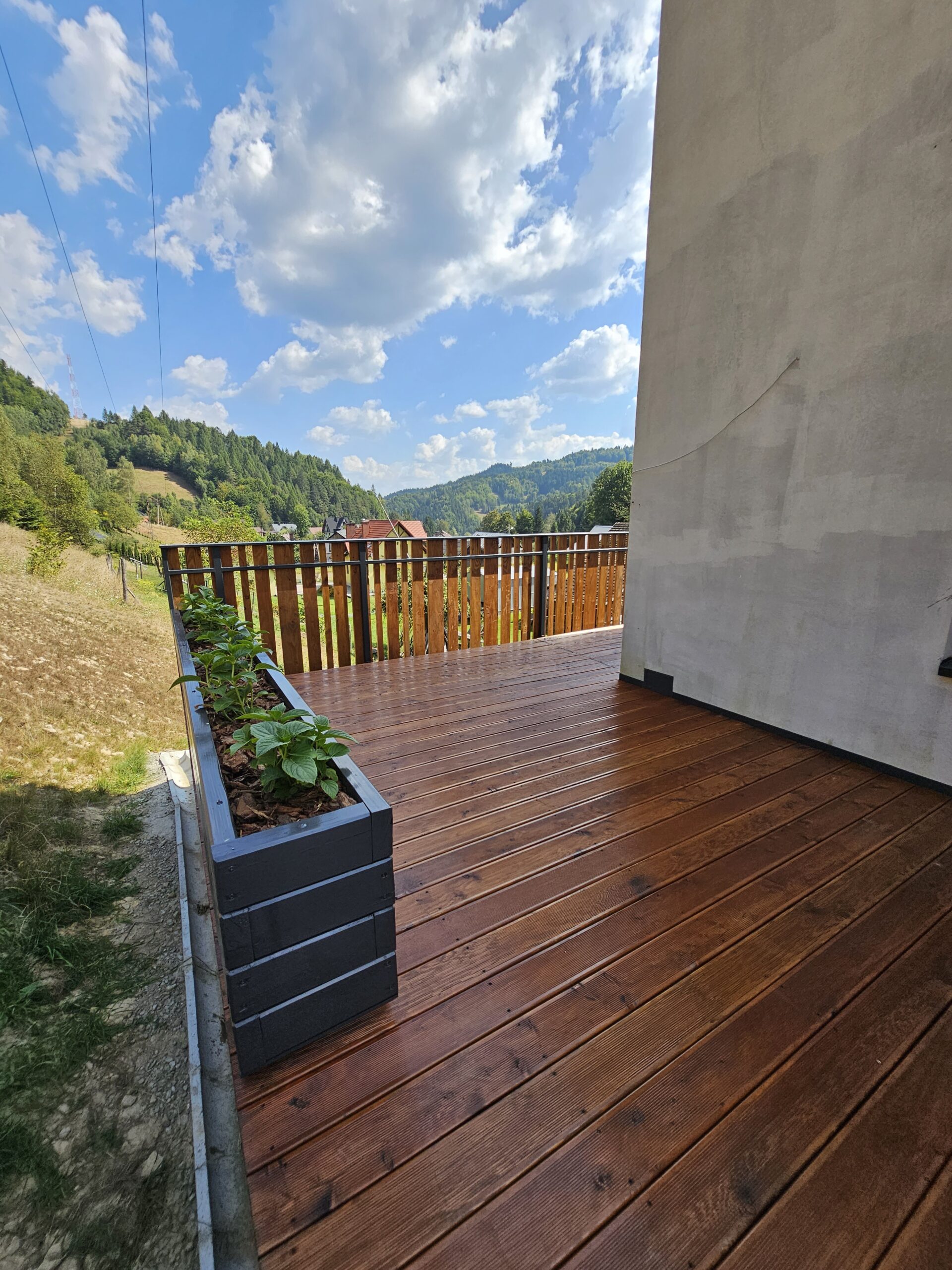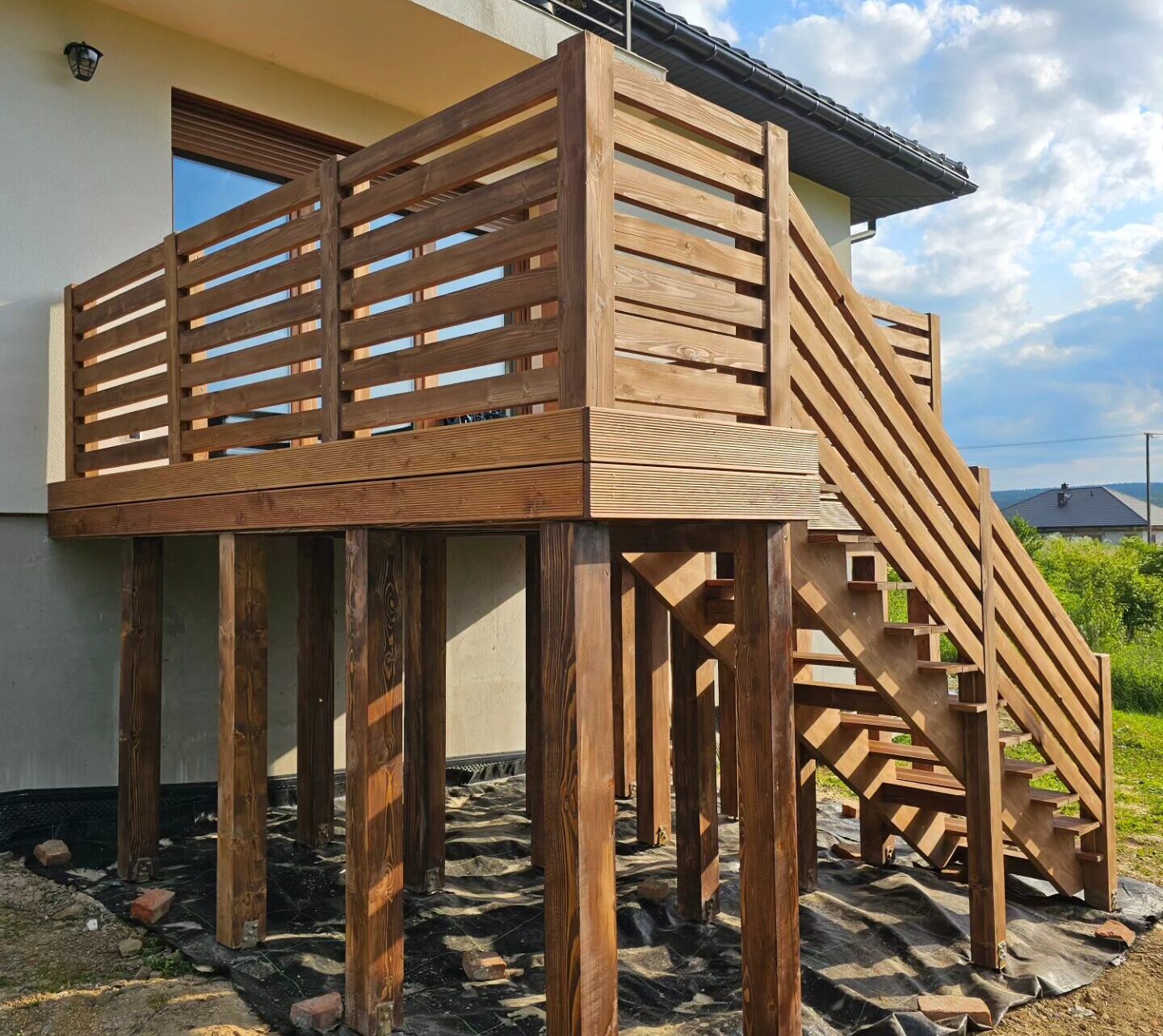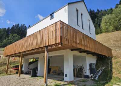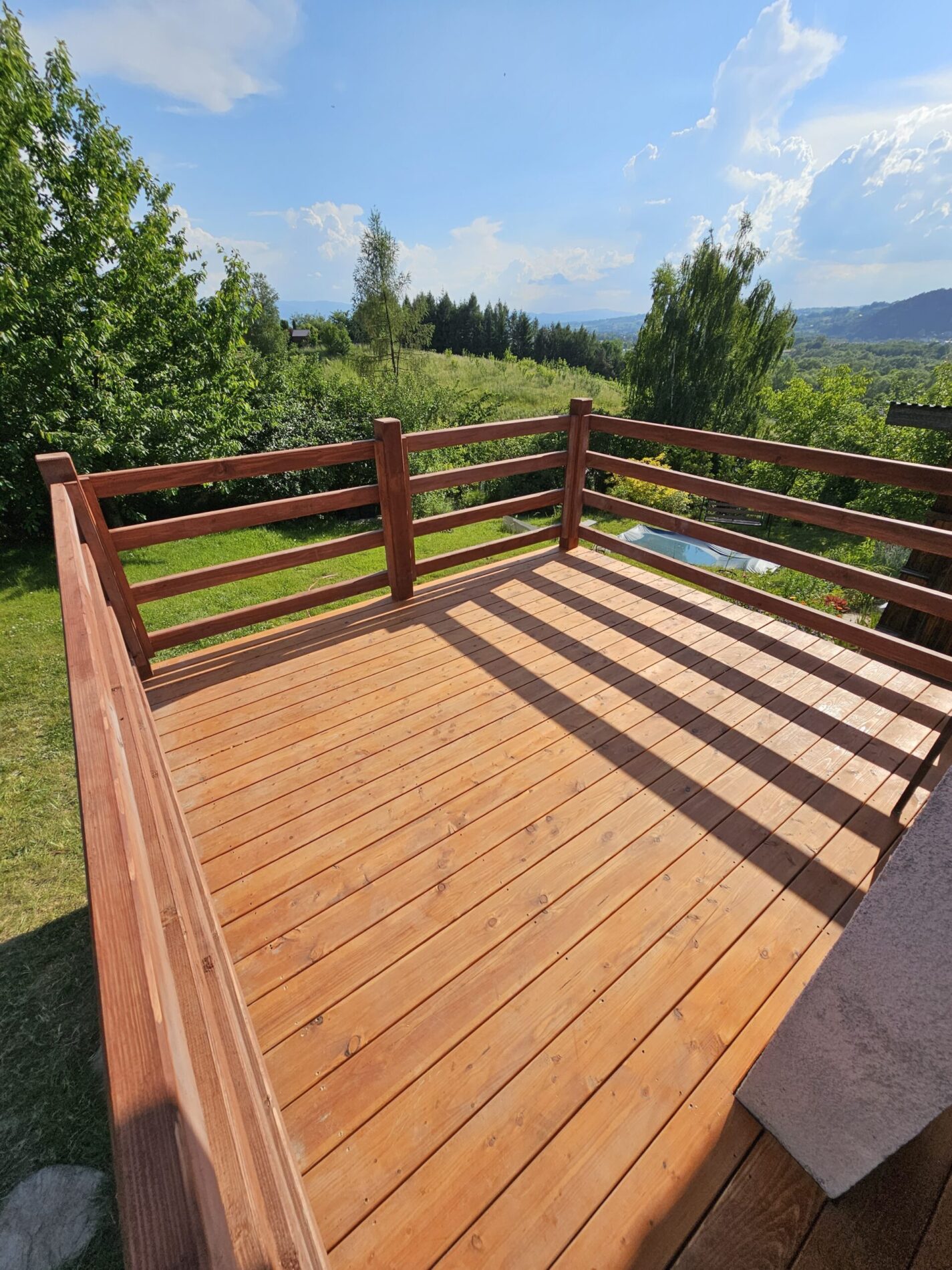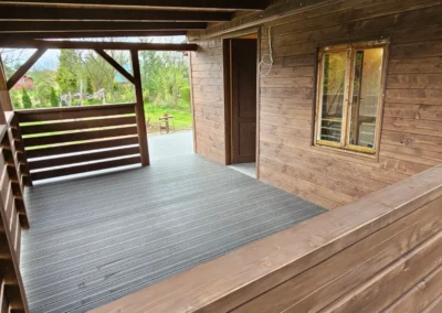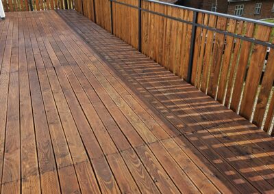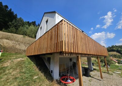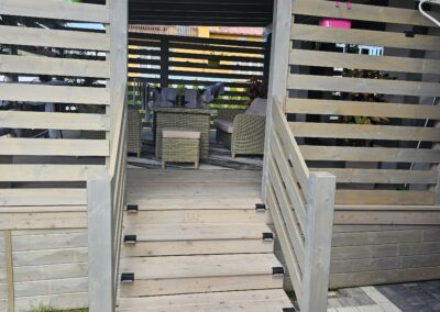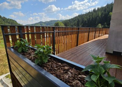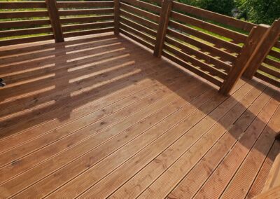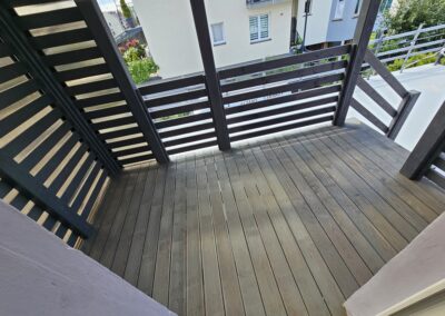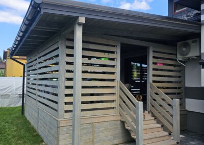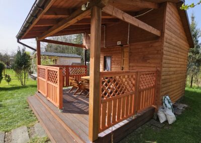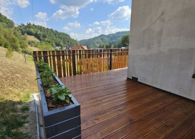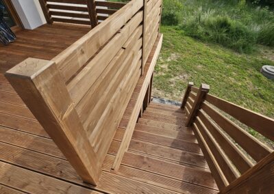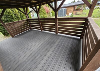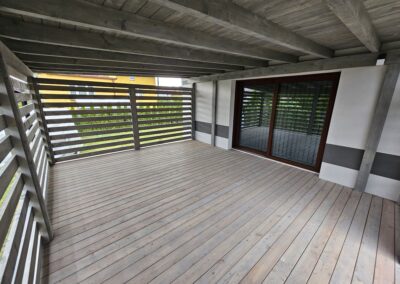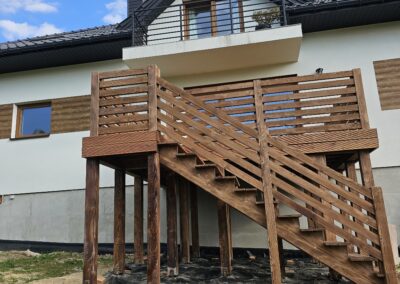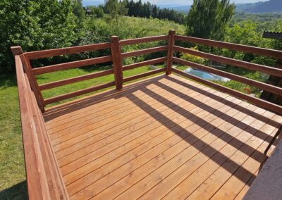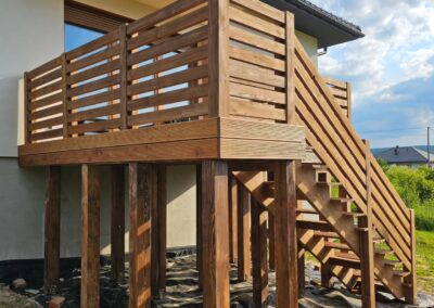Kompleksowa realizacja tarasów drewnianych. Przygotowanie podłoża, konstrukcja nośna, układanie legarów i desek. Drewno starannie impregnowane i zabezpieczane na lata użytkowania