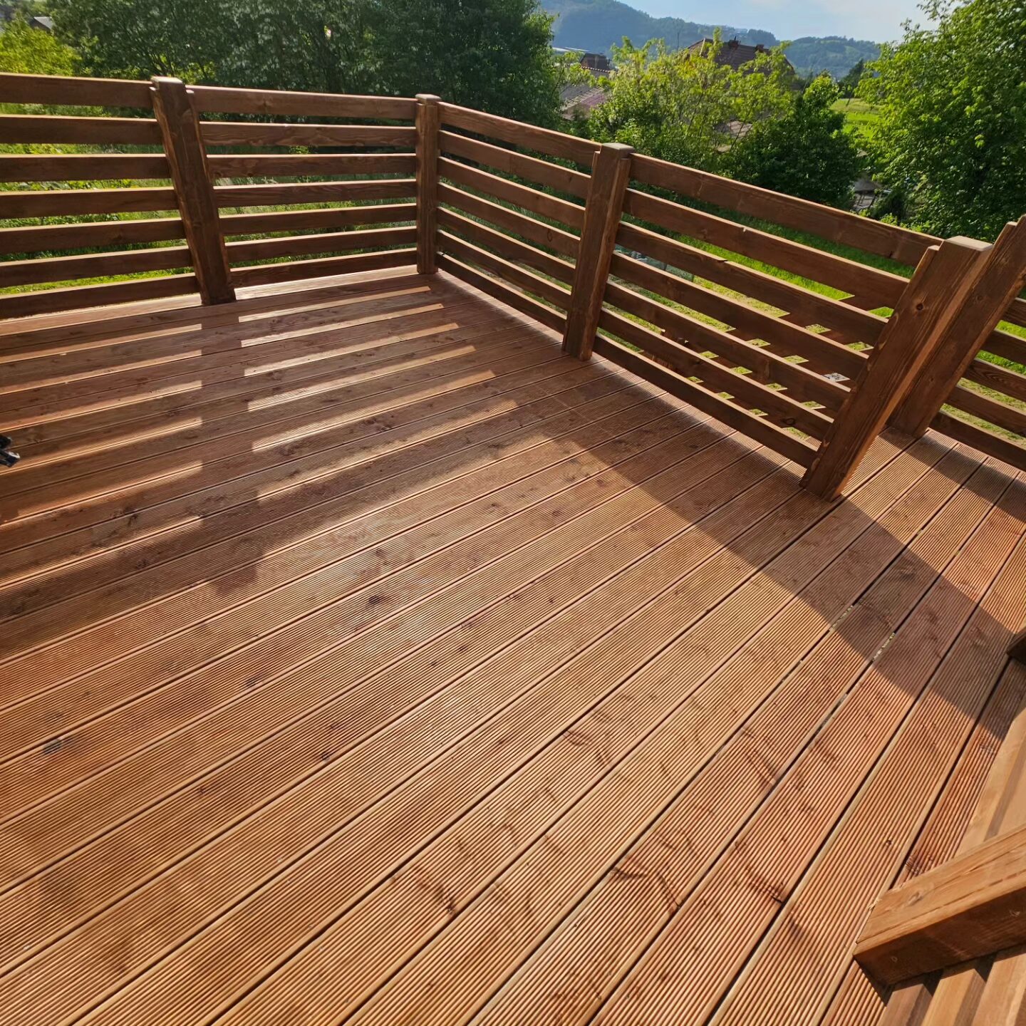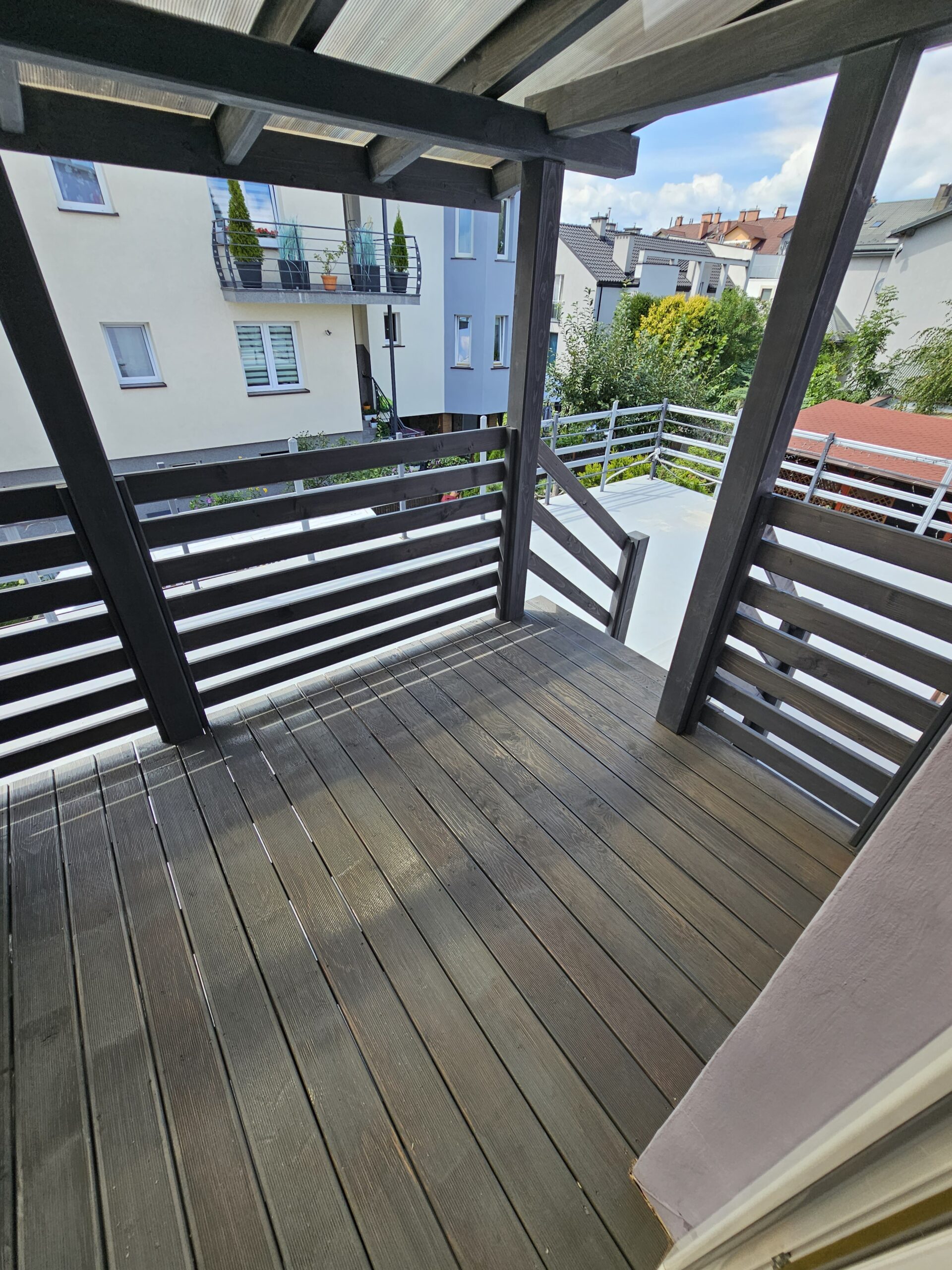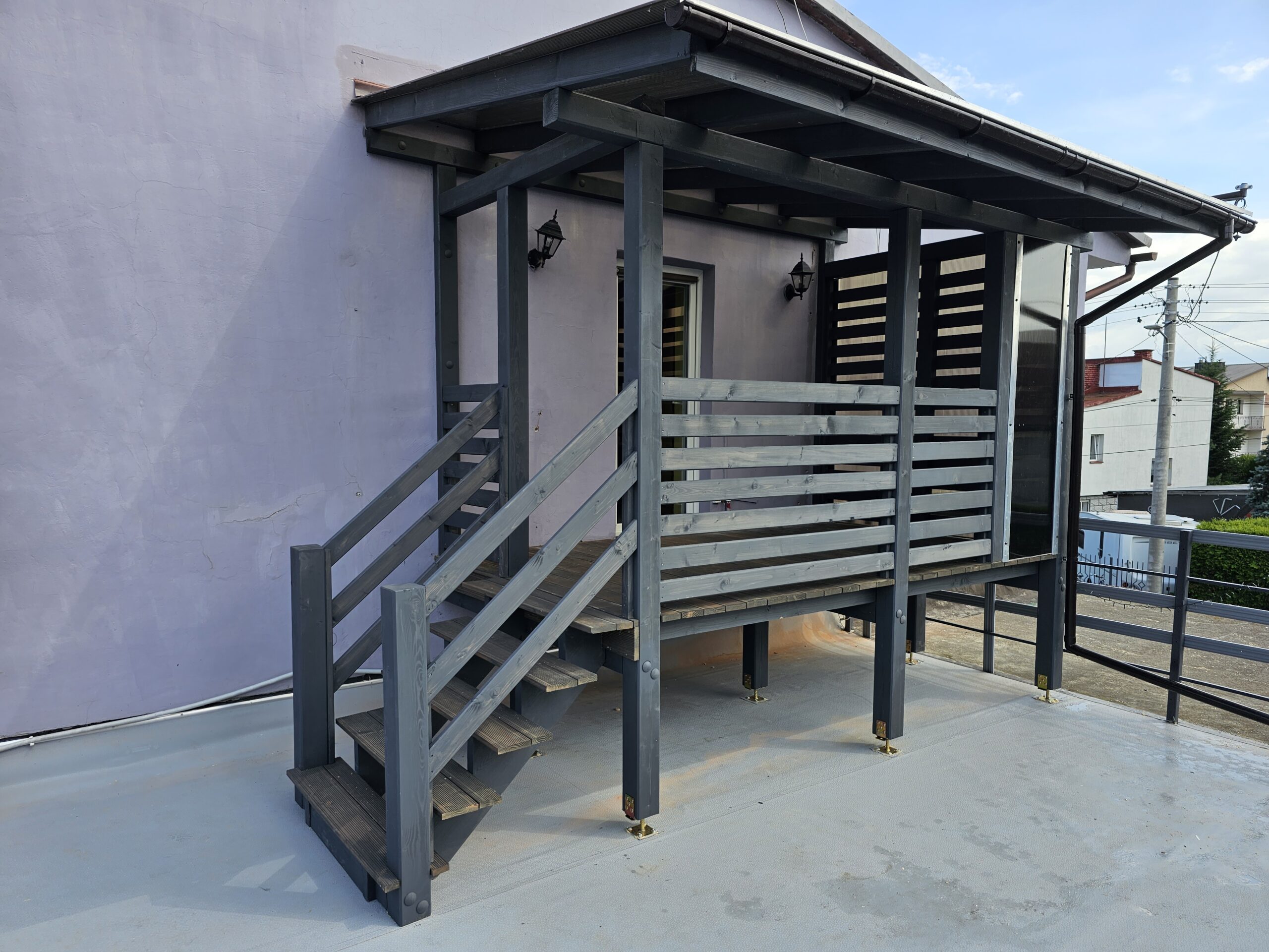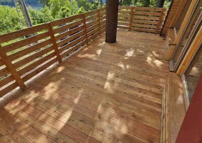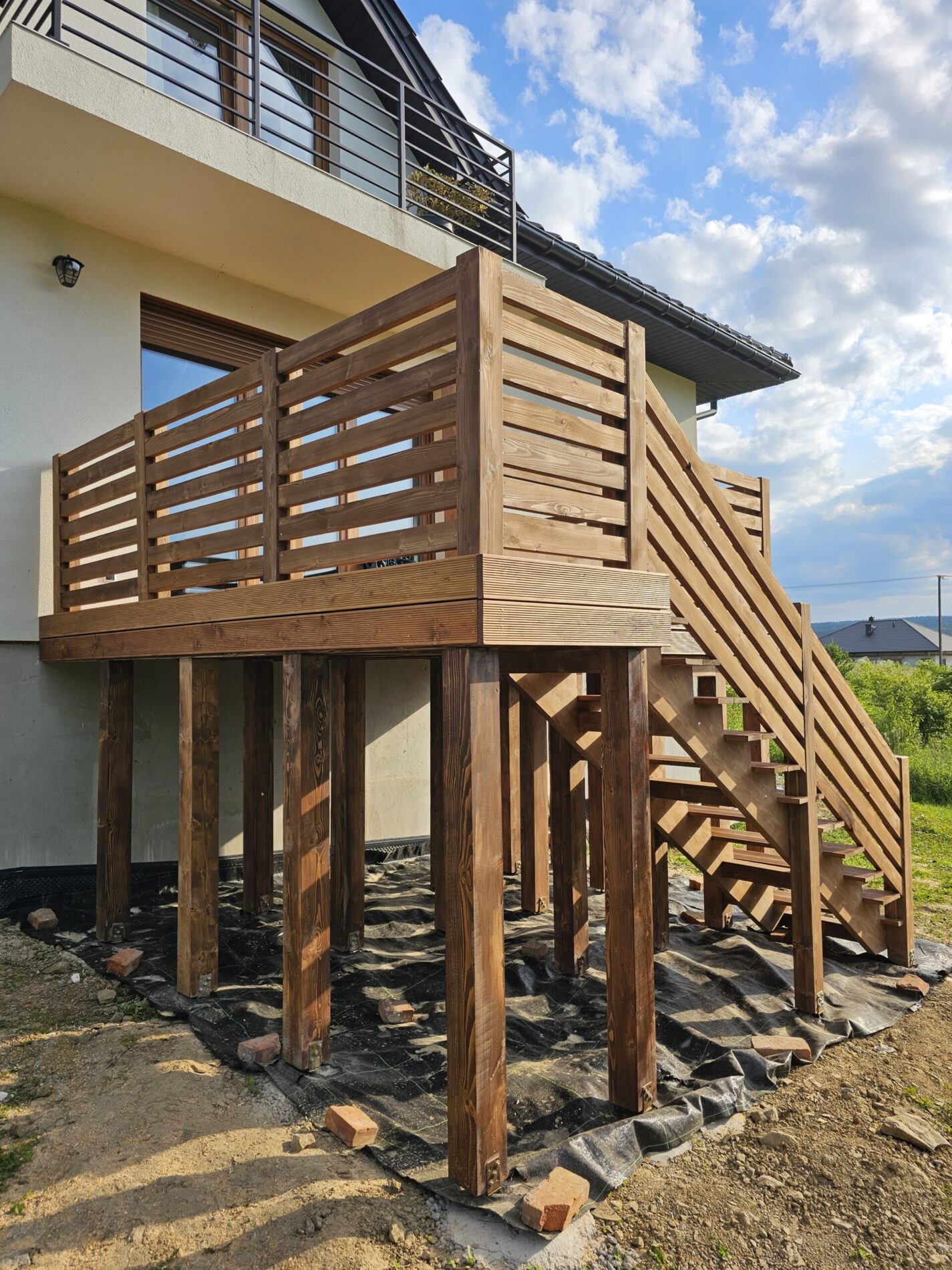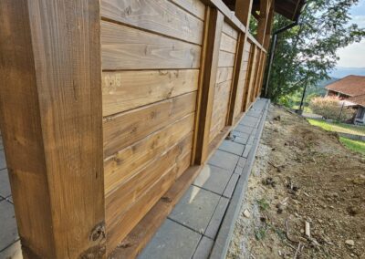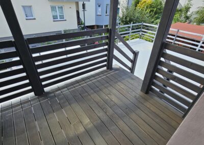 Kompleksowa realizacja tarasów drewnianych. Przygotowanie podłoża, konstrukcja nośna, układanie legarów i desek. Drewno starannie impregnowane i zabezpieczane na lata użytkowania