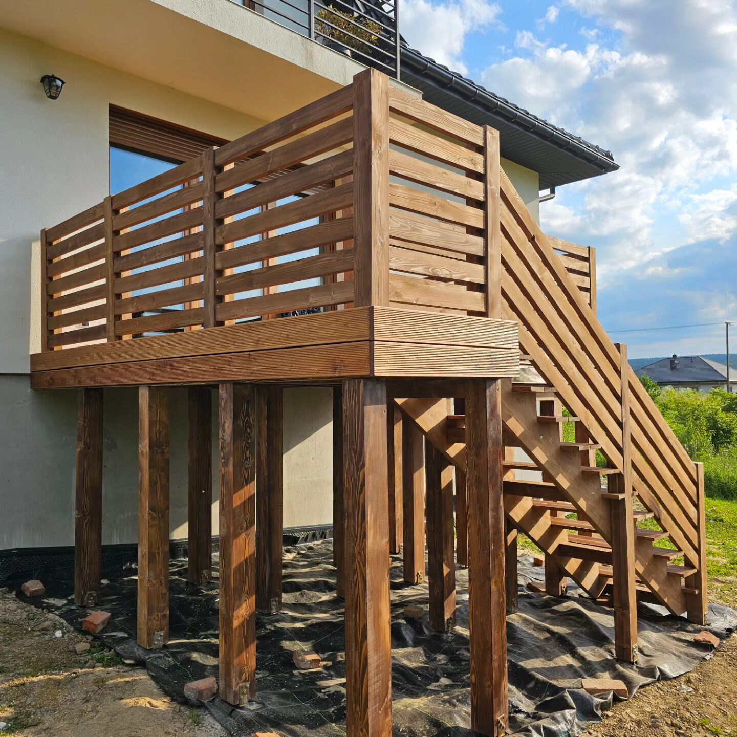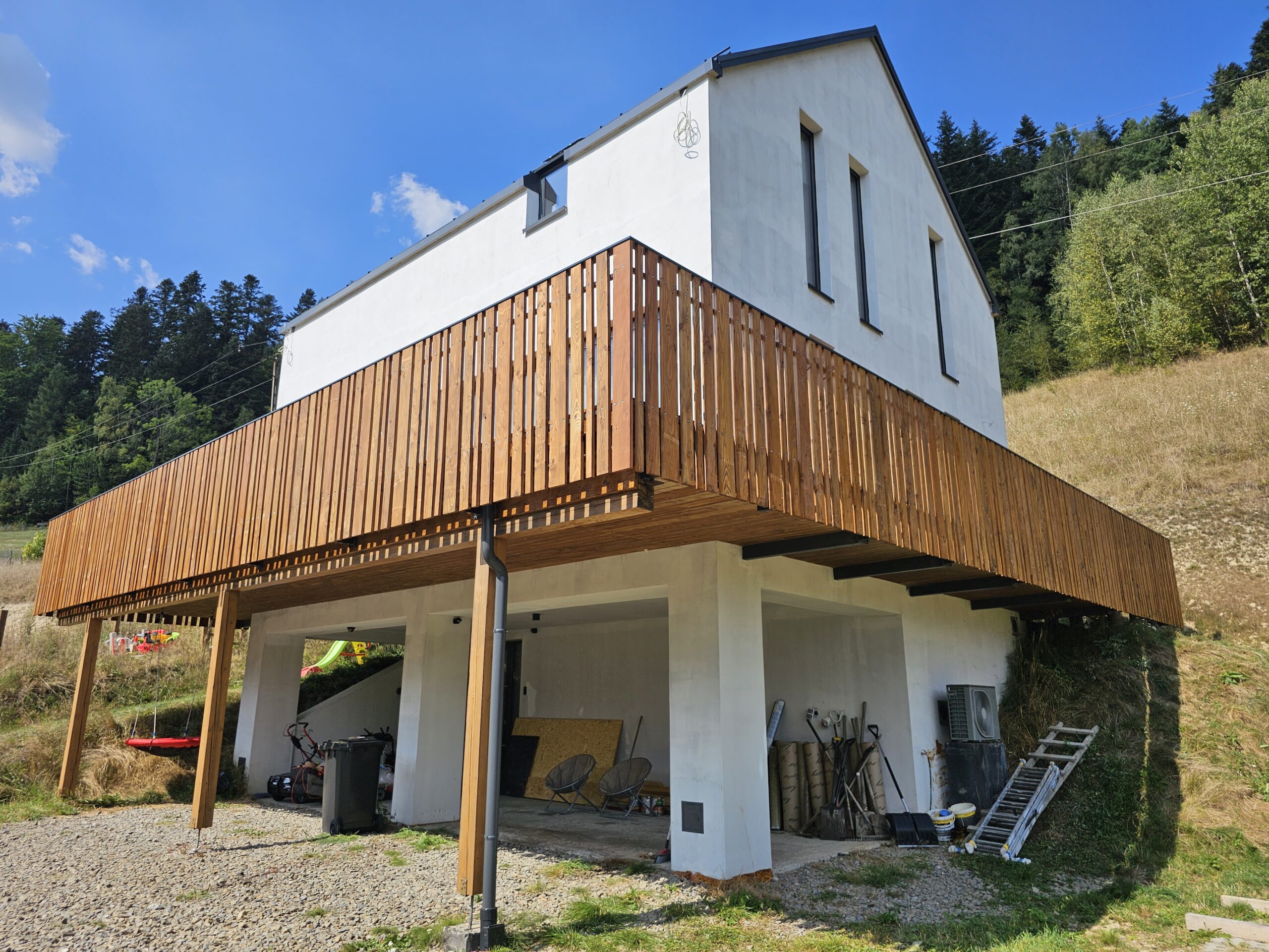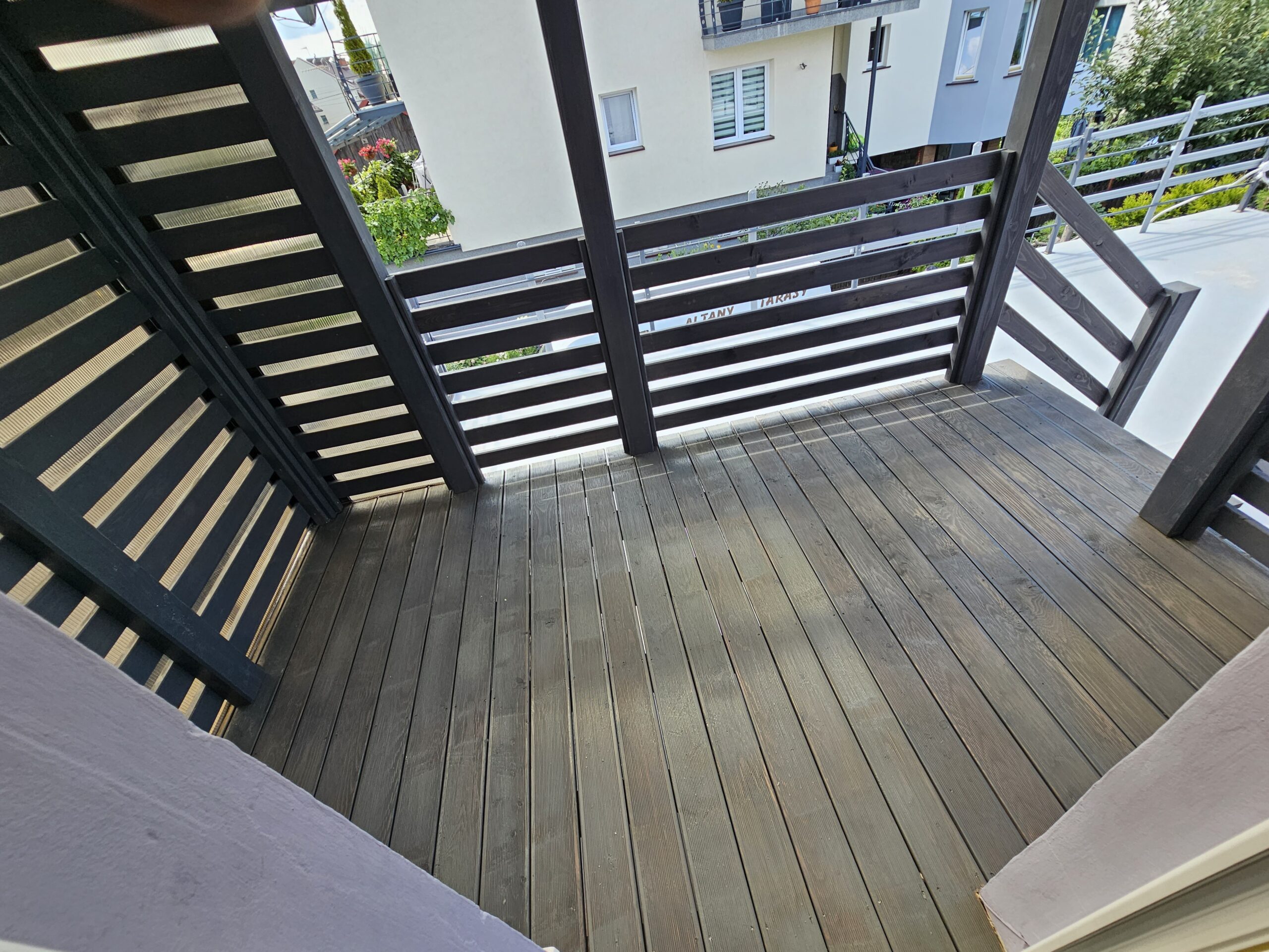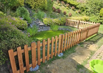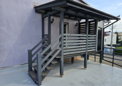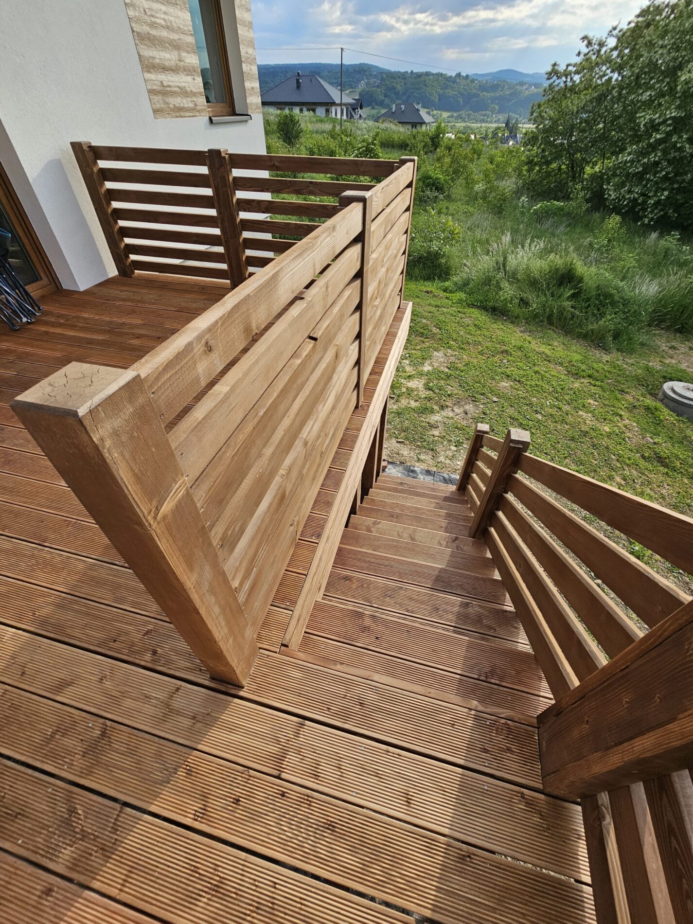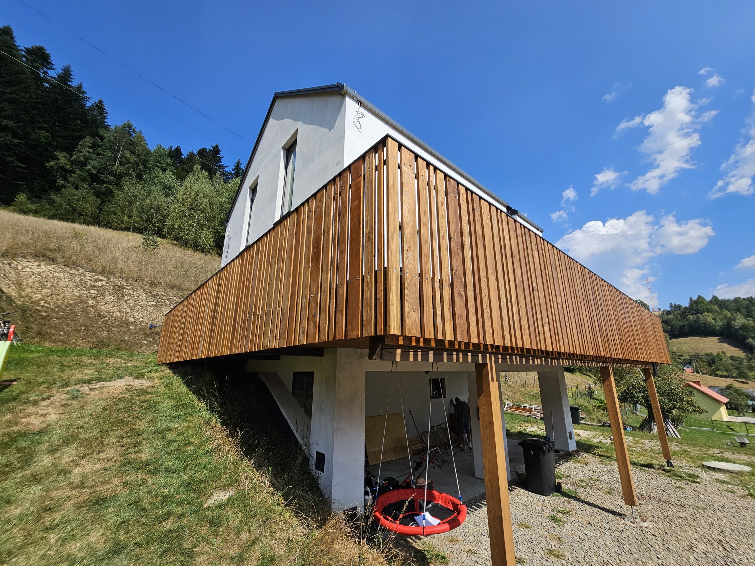 Kompleksowa realizacja tarasów drewnianych. Przygotowanie podłoża, konstrukcja nośna, układanie legarów i desek. Drewno starannie impregnowane i zabezpieczane na lata użytkowania