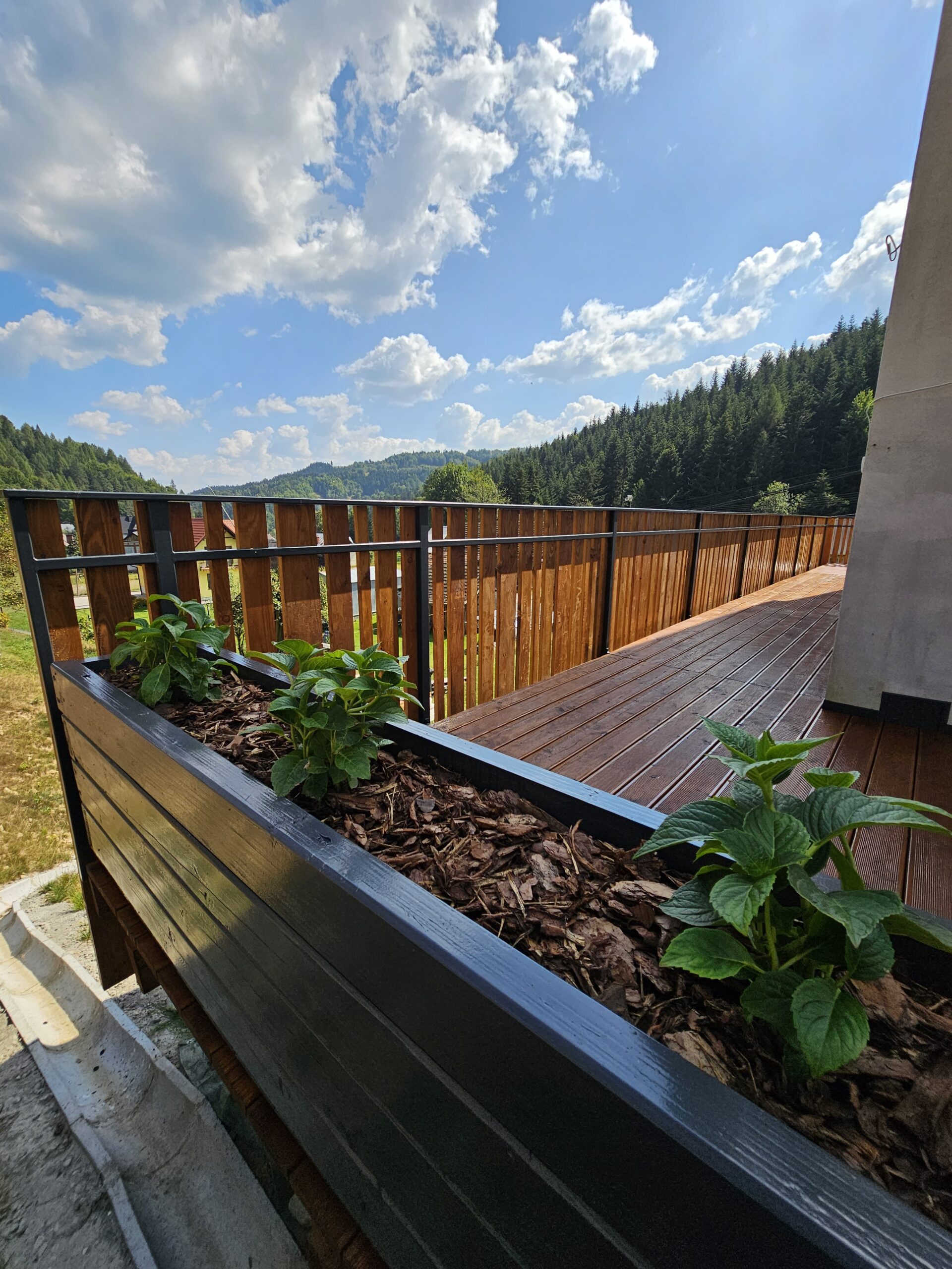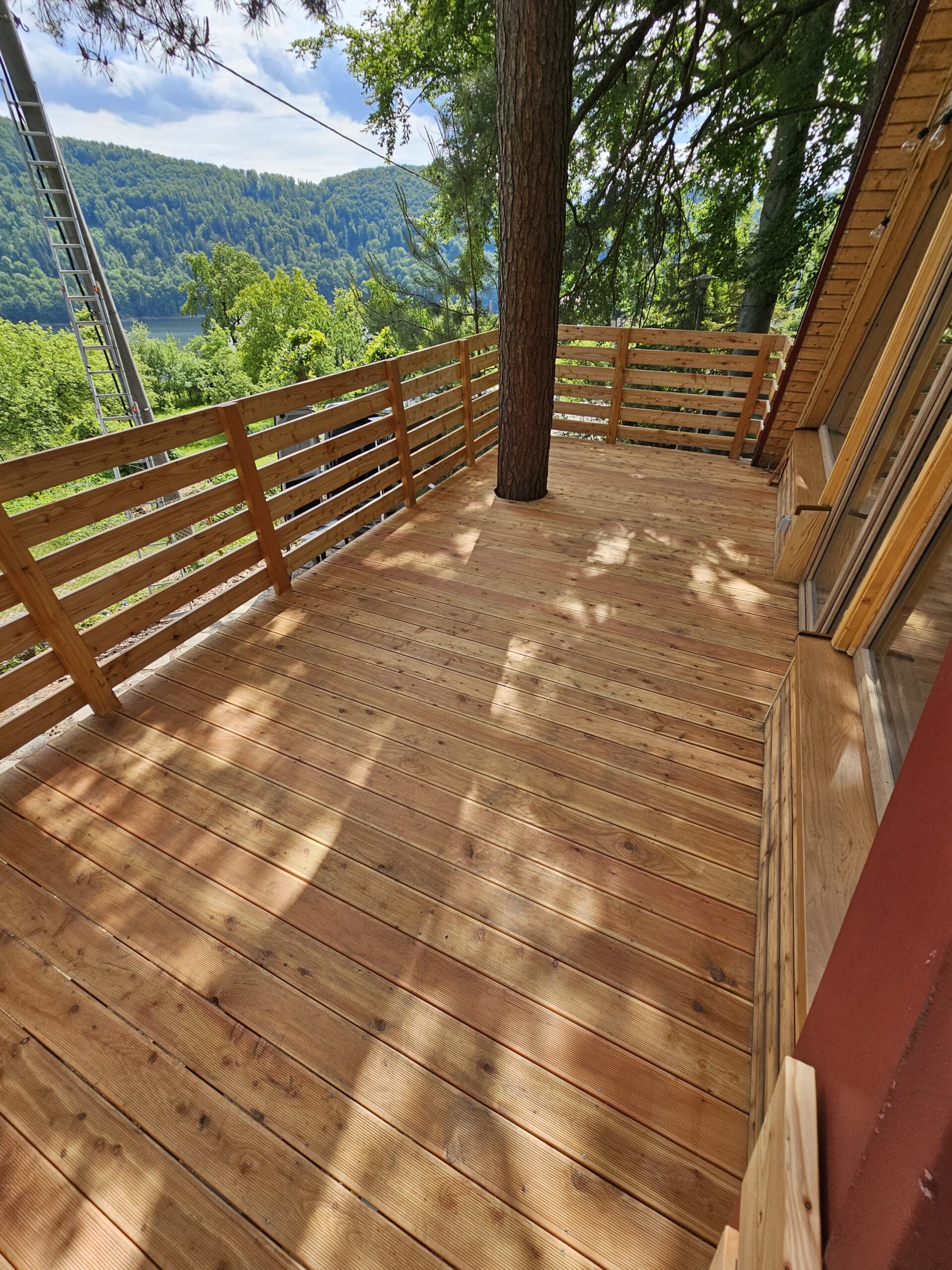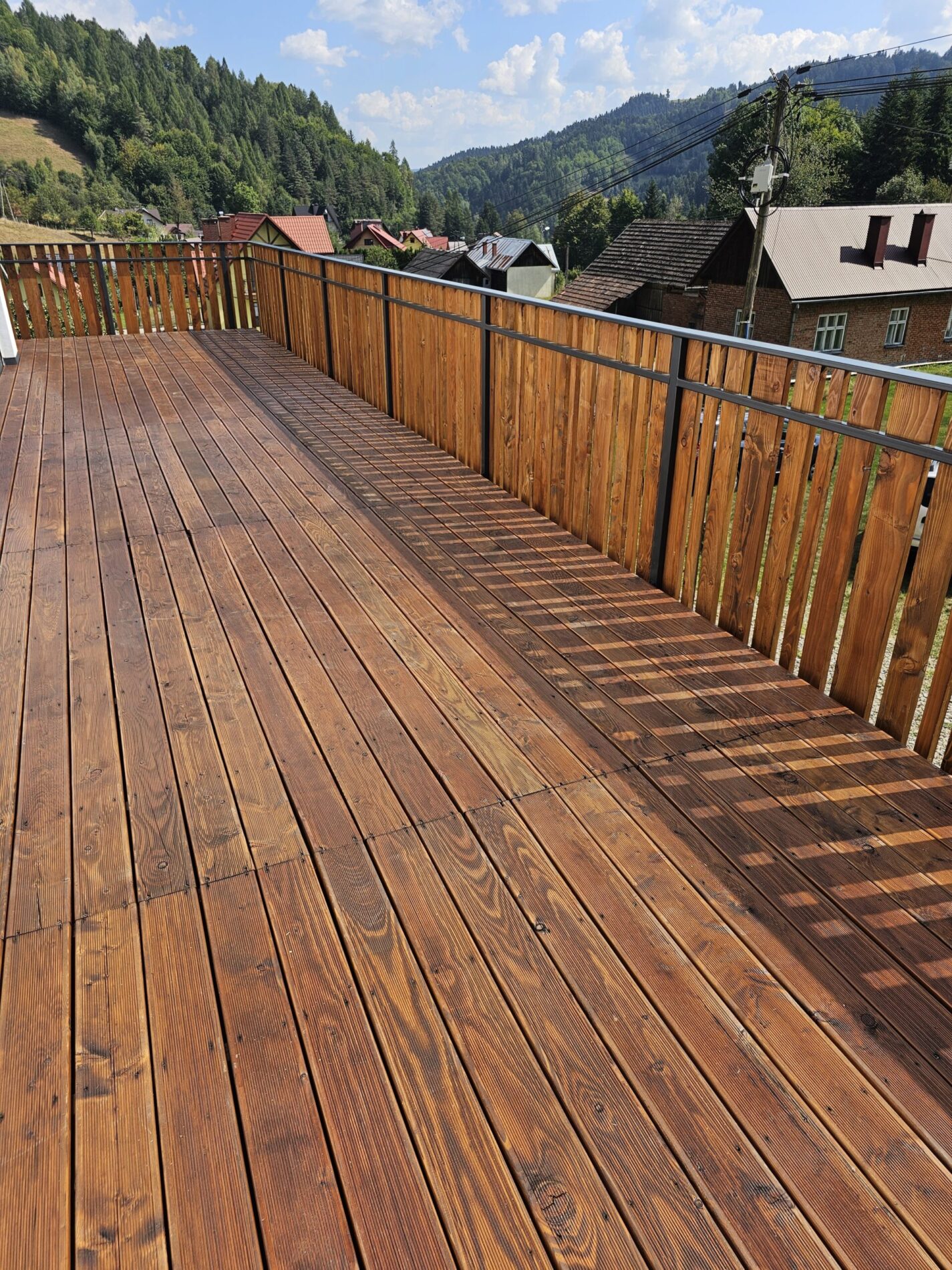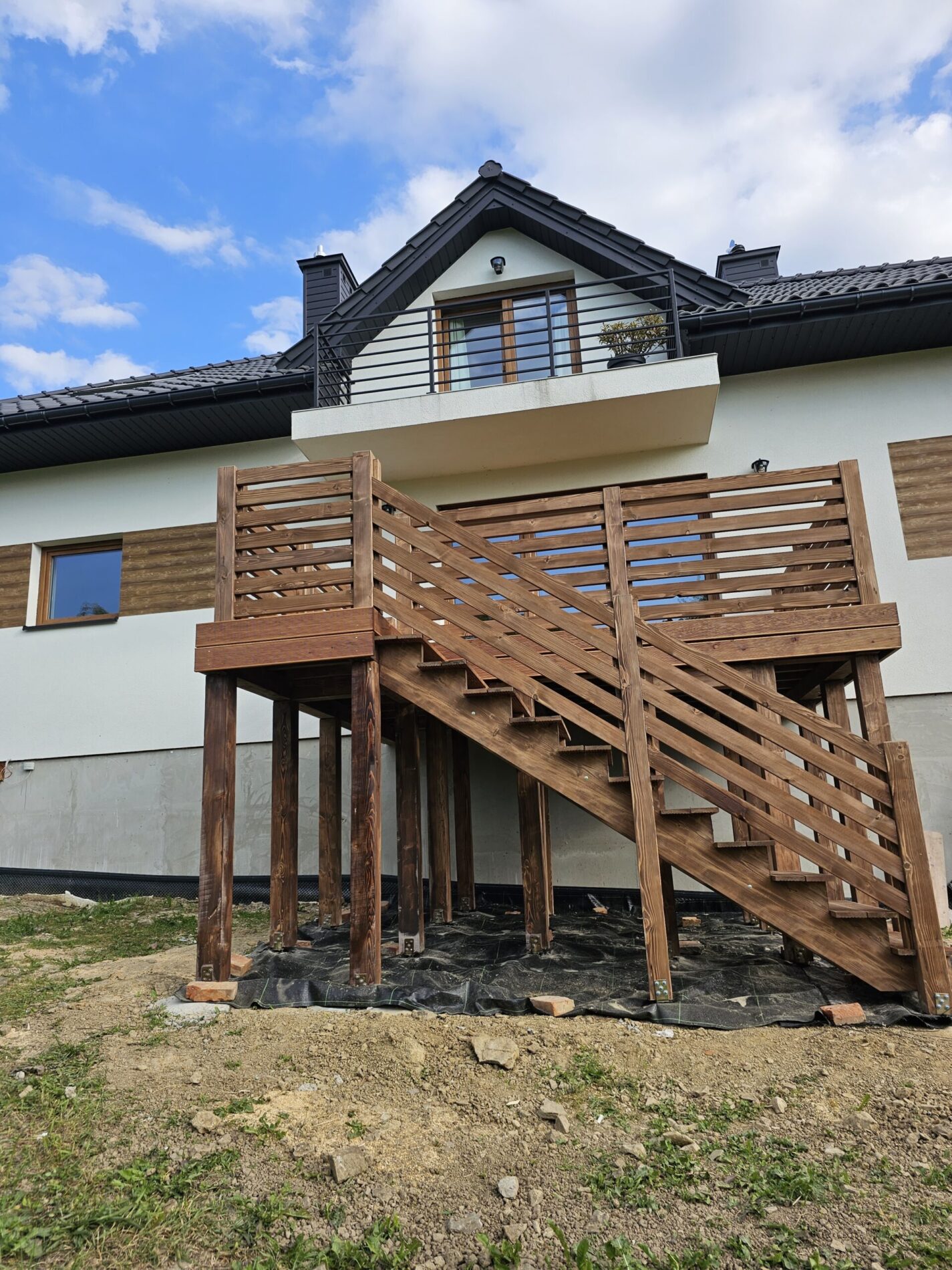Kompleksowa realizacja tarasów drewnianych. Przygotowanie podłoża, konstrukcja nośna, układanie legarów i desek. Drewno starannie impregnowane i zabezpieczane na lata użytkowania