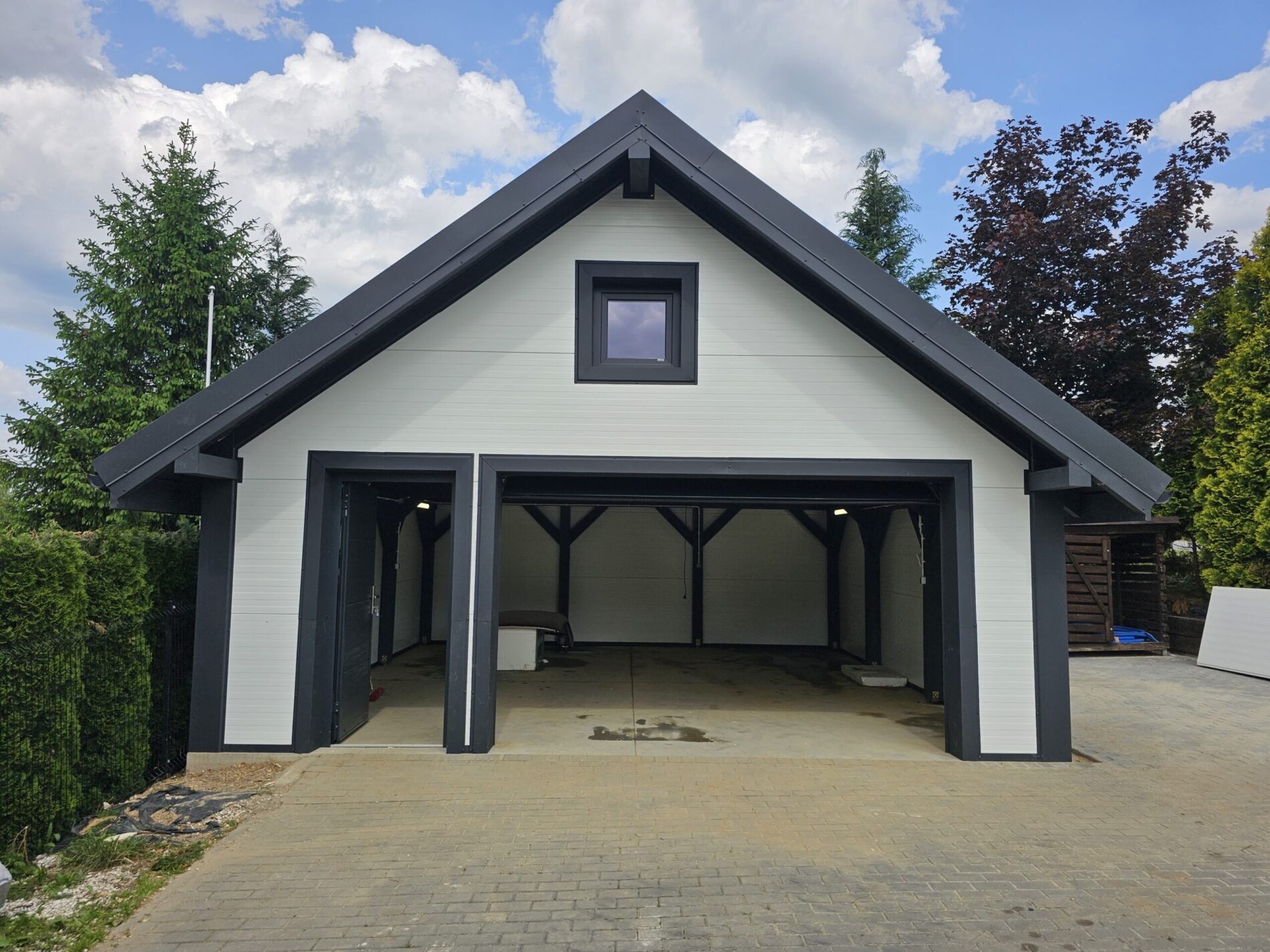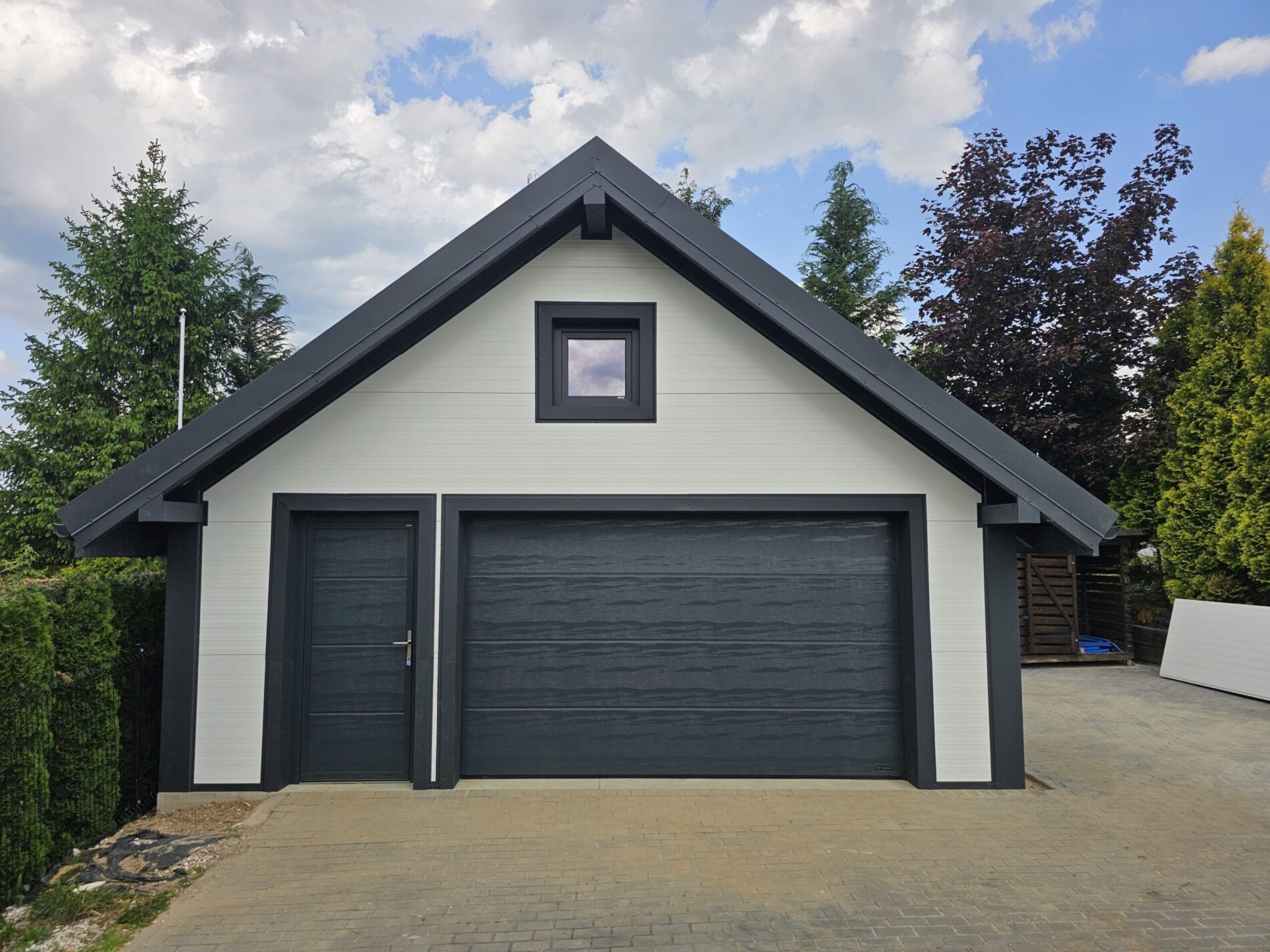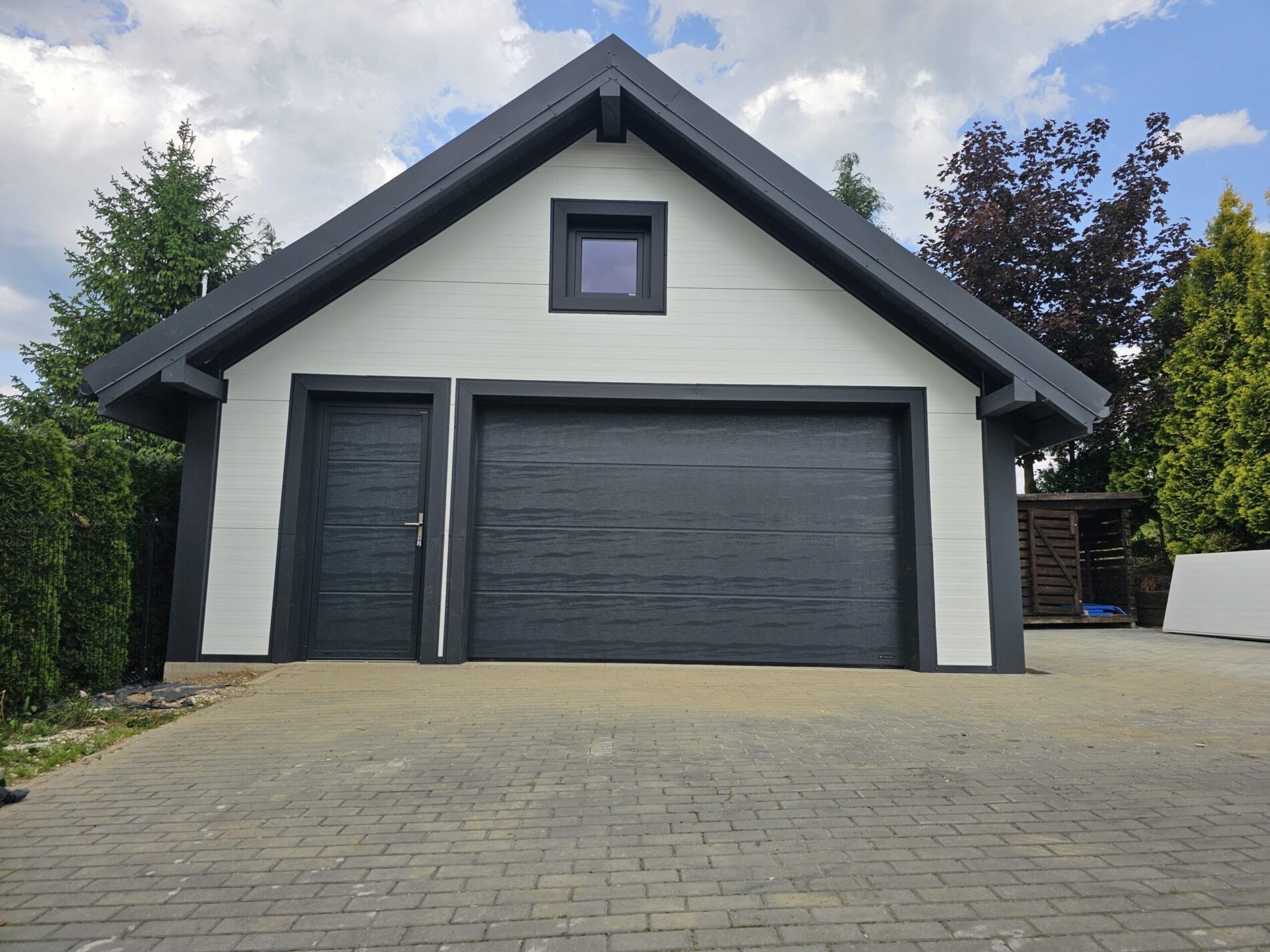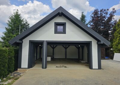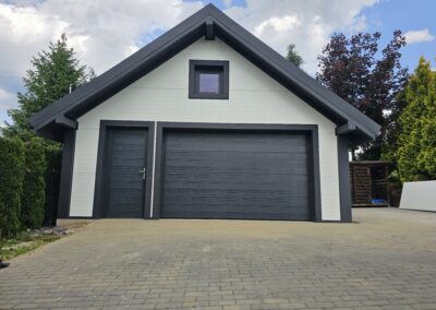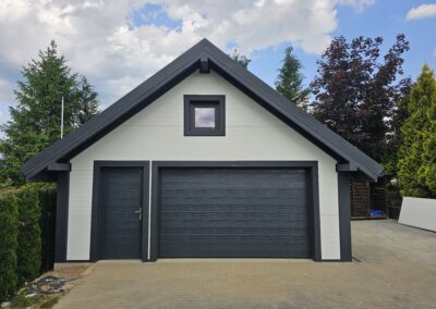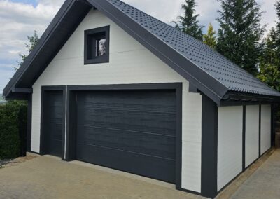 Wykonujemy garaże z płyty warstwowej na solidnej konstrukcji drewnianej. Kompleksowy montaż z instalacją bram segmentowych z automatyką oraz montażem okien i drzwi