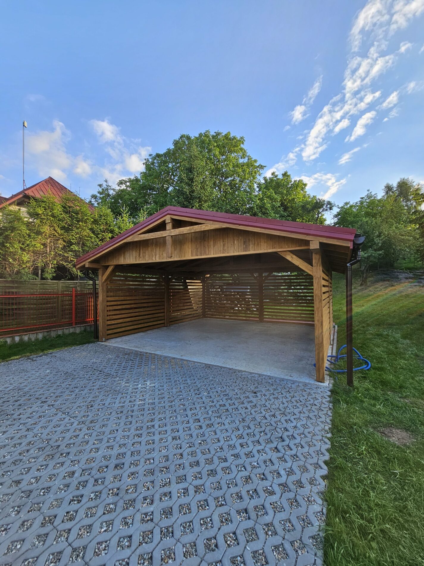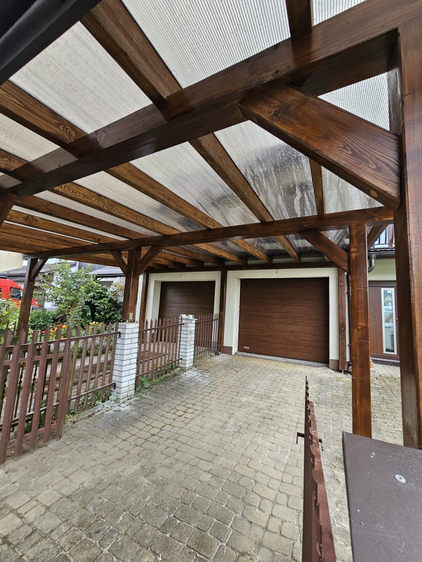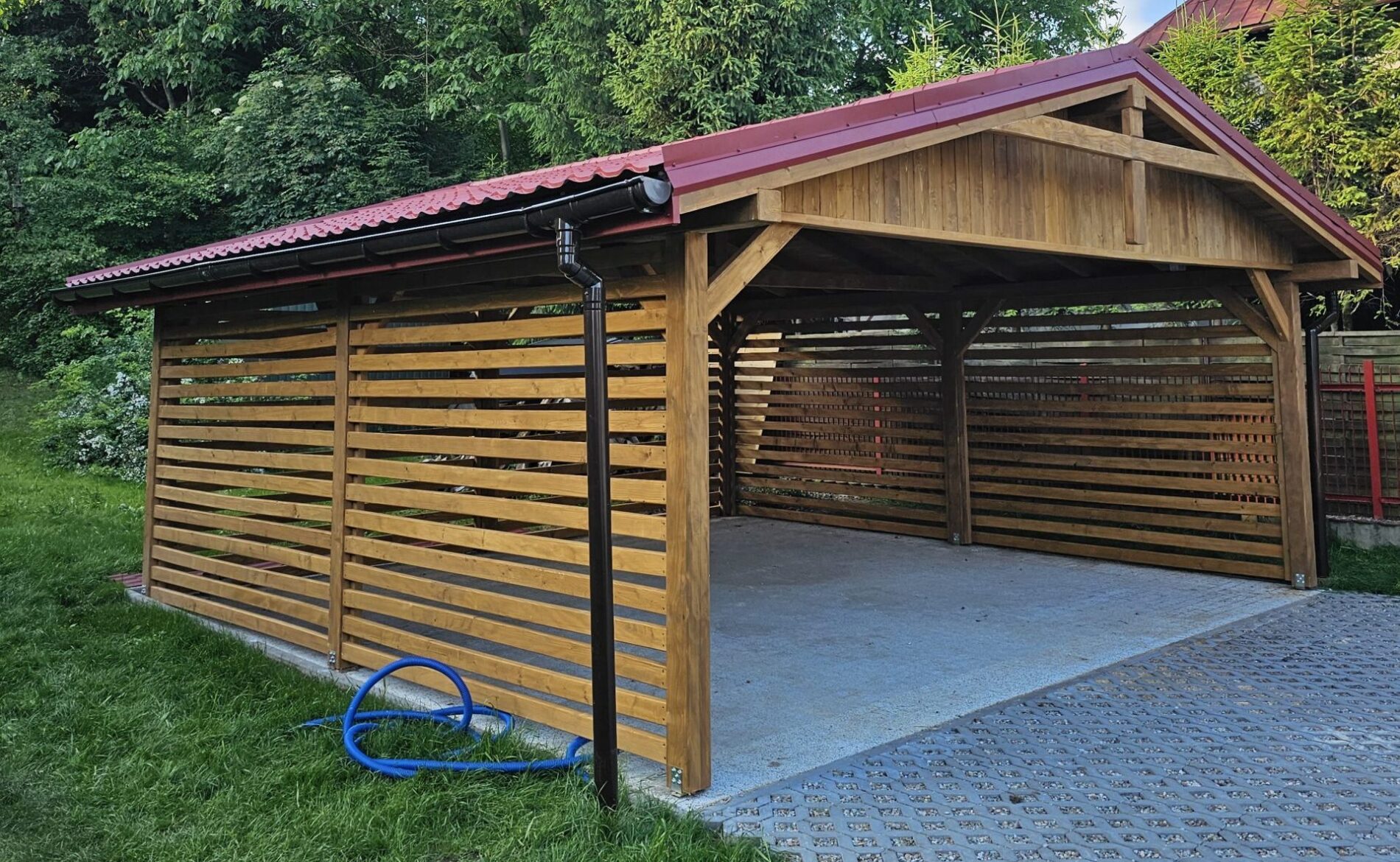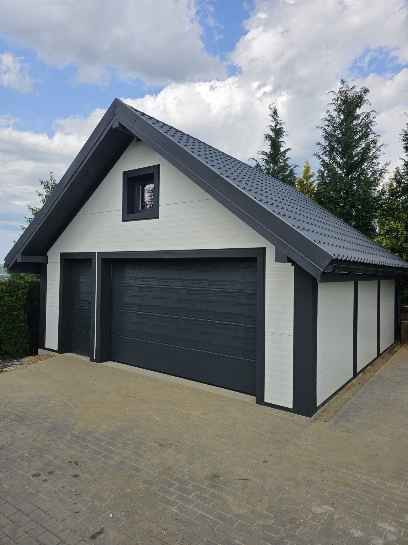 Wykonujemy garaże z płyty warstwowej na solidnej konstrukcji drewnianej. Kompleksowy montaż z instalacją bram segmentowych z automatyką oraz montażem okien i drzwi